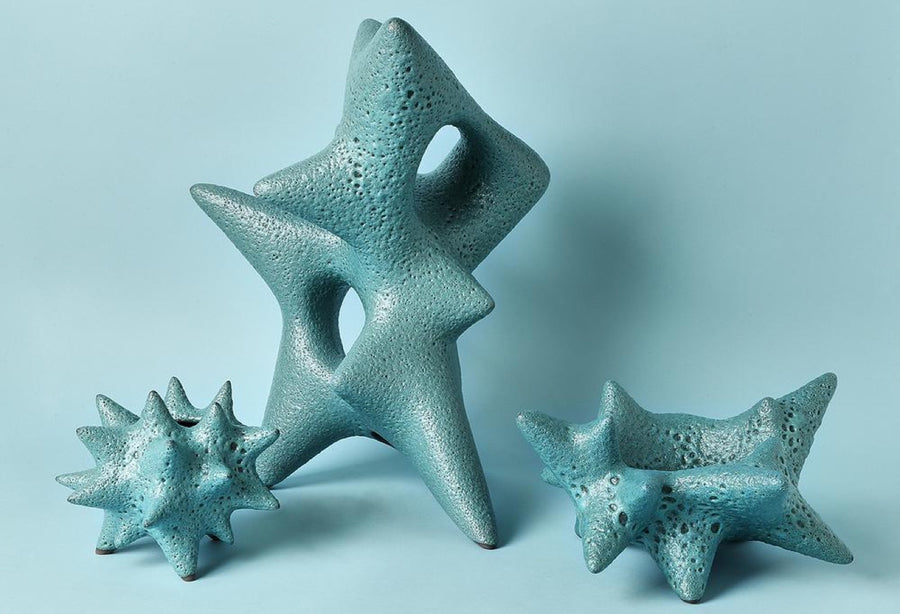 Double-sided stoneware featuring melted glass cooled to a sparkle.